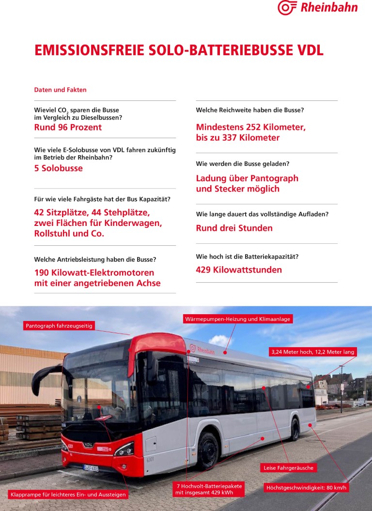 Die Neuzugänge aus der niederländischen und belgischen VDL-Produktion, deren Anschaffung zum Teil über eine Förderung des Verkehrsverbunds Rhein-Ruhr (VRR) erfolgt ist, sind die ersten rein batterie-elektrisch betriebenen 18 Meter langen Gelenkbusse in der Rheinbahnflotte. Sie fahren, da auch die Heizung rein elektrisch ist, komplett emissionsfrei. Die Busse werden vom Betriebshof Heerdt aus eingesetzt und dort über einen Pantographen auf dem Busdach über die Ladehauben im E-Bus-Port geladen. Die Ladezeit für einen Gelenkbus beträgt rund drei Stunden.